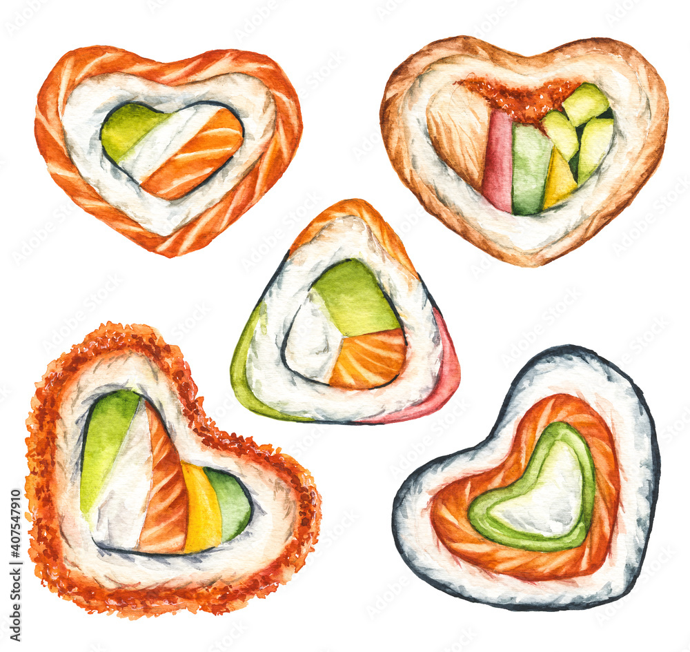 Watercolor Hand Drawn Set Of Rolls In The Shape Of A Heart Isolated On White Background Japanese Heart Shaped Food For Valentines Day Romantic Menu Concept Stock Vector Adobe Stock